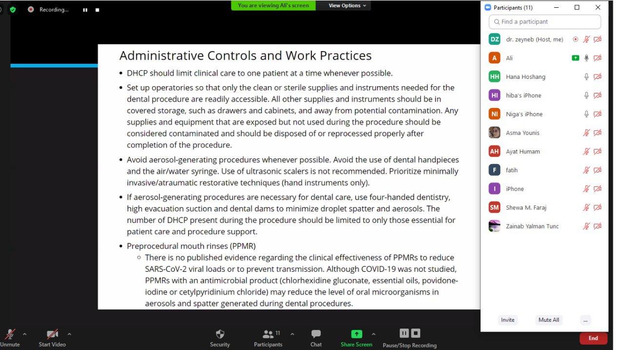 On 27 July, 2020 at 11:00 am Mr.Fatih yilmaz and Dr.Zainab Yalman the representives of Dean of students Office in Dentistry Faculty at TIU, organized a seminar for the Graduated Dentists of TIU under the Title of ( Corona Virus and Dentistry).The seminar was presented by Dr. Alishir Babakuliyev ,the Vise Dean of Dentistry Faculty. Eleven graduated dentists participated in the seminar. The seminar was done online using Zoom platform due to corona pandemic .The aim of the seminar was to teach the young dentist how to protect themselves and the patients and practice Dentistry safely and perfectly during the time of Corona virus pandemic.