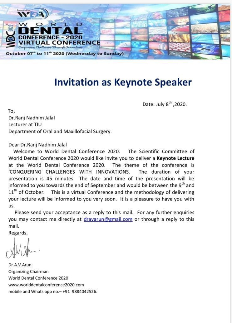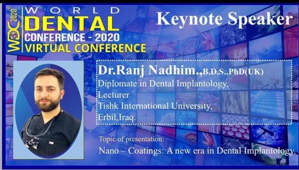 Dr.Ranj Nadhim Jalal, phd, a member of the academic staff of Dentistry Faculty in Tishk International University in Erbil, KRG, participated in (World Dental Conference) as a keynote speaker .The World Dental Conference is a virtual conference having speakers all around the world to cover almost all areas of dentistry and it was hold between 7-11 October, 2020.