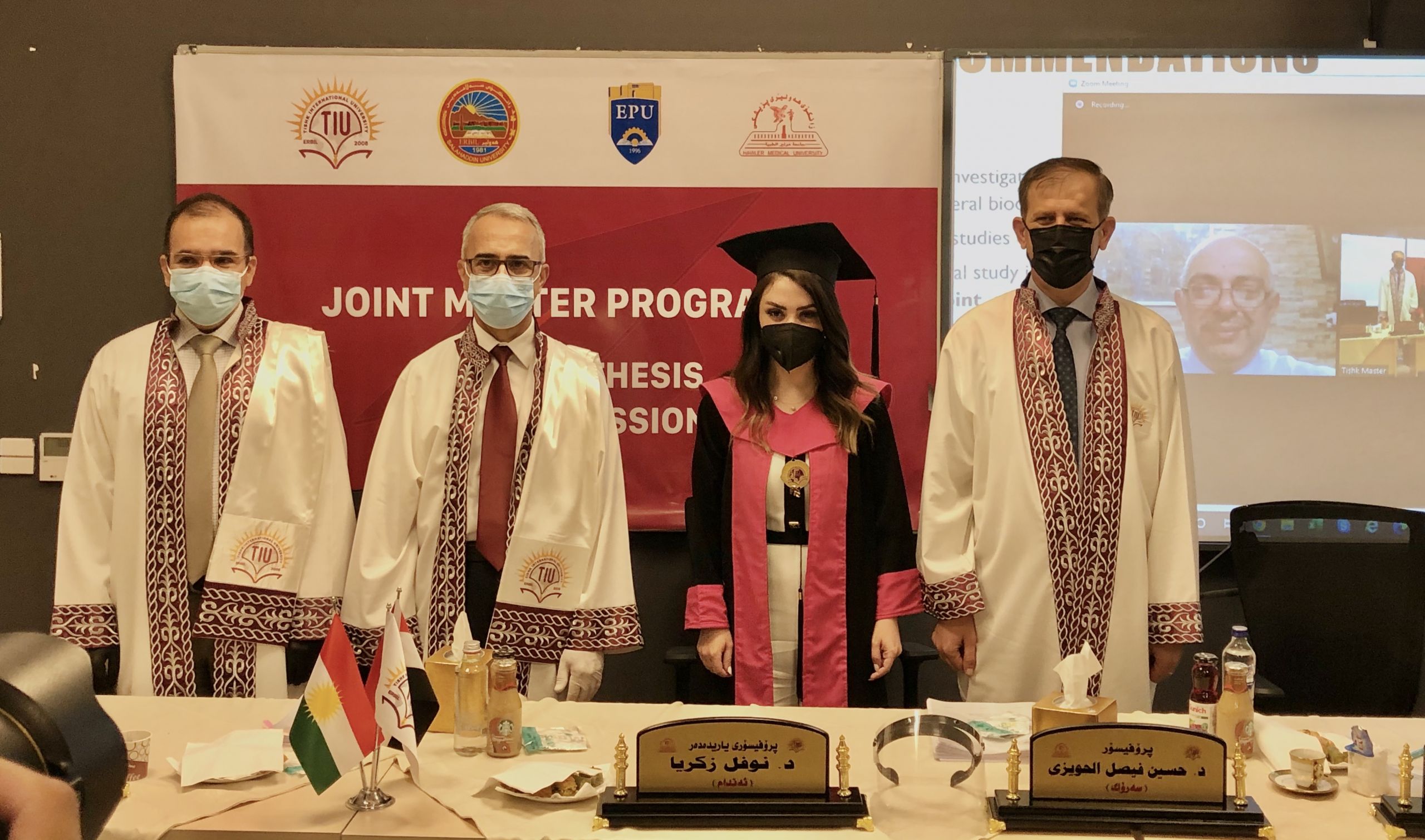 Dentistry Faculty in Tishk International University (TIU) started the first Joint Master Program in collaboration with Hawler Medical University (HMU) on April ,2018. On 6th August of 2020 , the First master defense session of the Joint Program was held in the presence of Dr.Duran Kala , the Dean of Dentistry Faculty -TIU , Dr.Dara Hama Rashid, The Dean of Dentistry Faculty-HMU, Dr.Rebuar Fadhil , the chief of Postgraduate Studies office-TIU , Dr. Diyar Khalid , the chief of Postgraduate Studies office-HMU and master defense committee members.