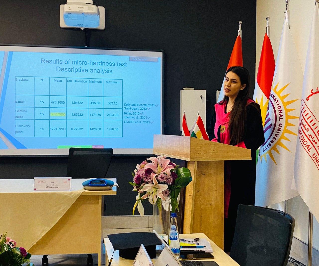 Sana Rizgar Ubeid which was a master candidate in the Orthodontics Department -Dentistry Joint program, presented her thesis to the discussion committee under the title of (Laboratory Evaluation of New E.Max Orthodontic Bracket- An in-vitro study).