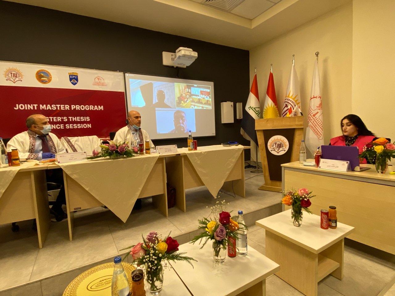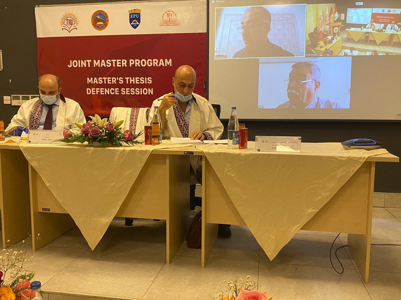 Dentistry Faculty in Tishk International University (TIU) started the first Joint Master Program in collaboration with Hawler Medical University (HMU) in April ,2018. On August 18, 2020 , the sixth master defense session of the Joint Program was held in the presence of Dr.Duran Kala , the Dean of Dentistry Faculty -TIU , Dr.Rebuar Fadhil , the chief of Postgraduate Studies office-TIU , Dr. Diyar Khalid , the chief of Postgraduate Studies office-HMU and master defense committee members.