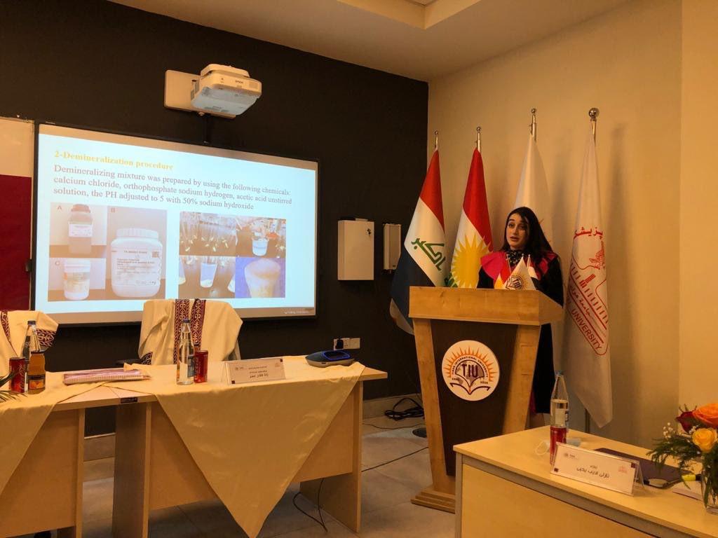 Nazli Adeeb Yahya which was one of the master master candidates in the Orthodontics Department -Dentistry Joint program, presented her thesis to the discussion committee under the title of (Evaluation of Different surface treatment methods on shear bond strength of orthodontic brackets on demineralized enamel).