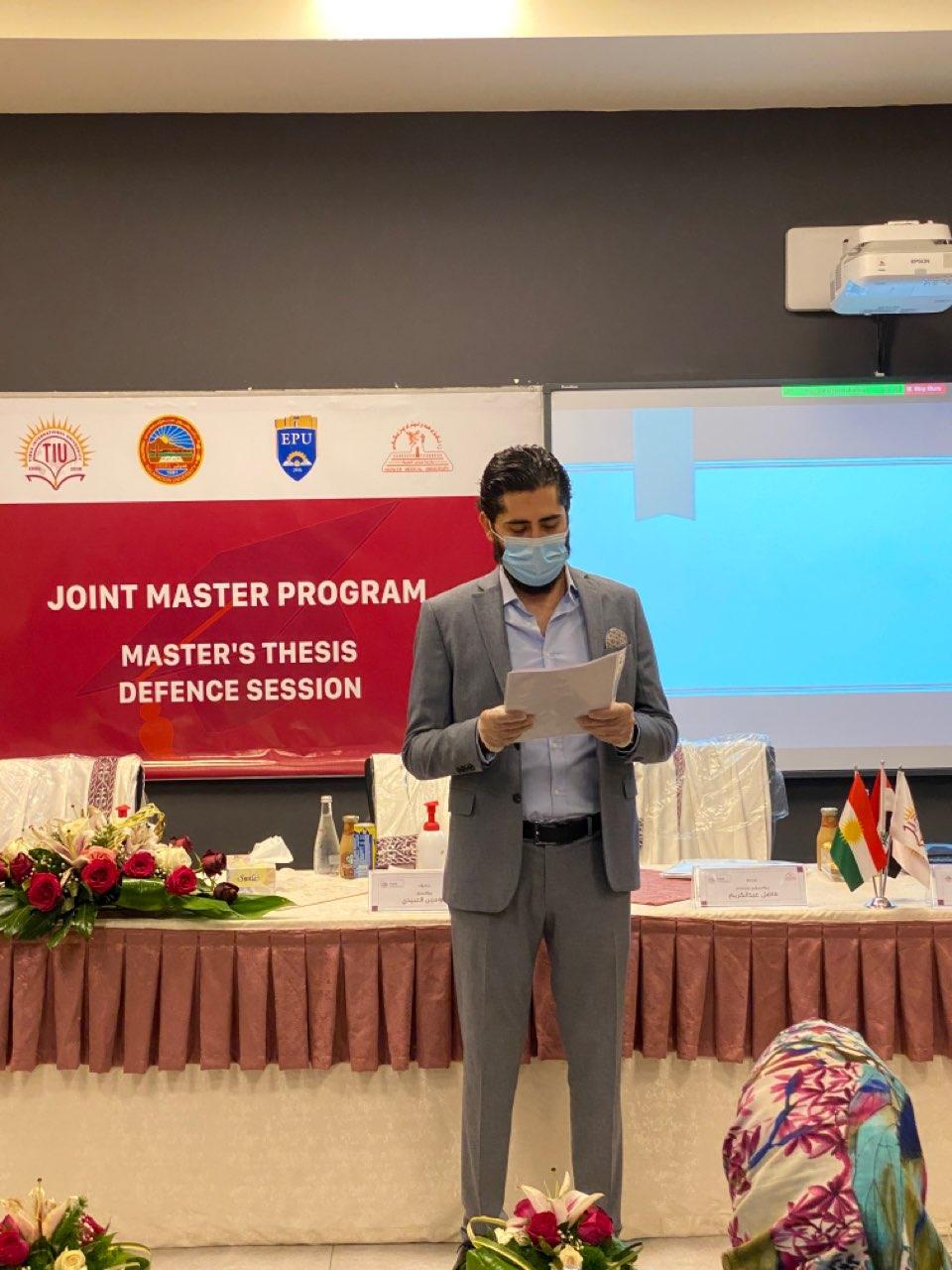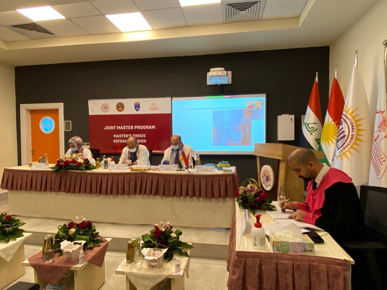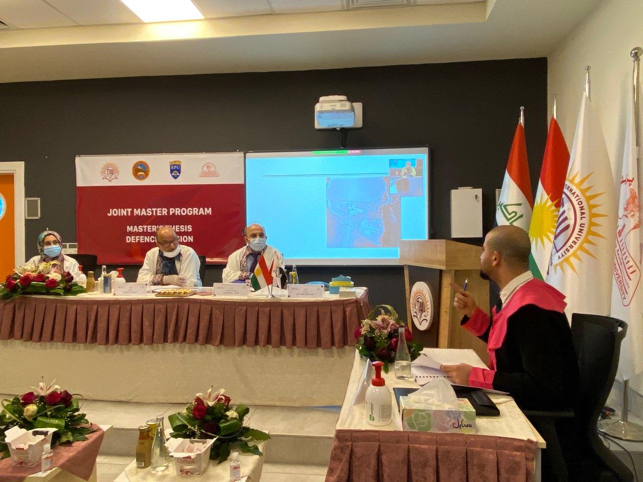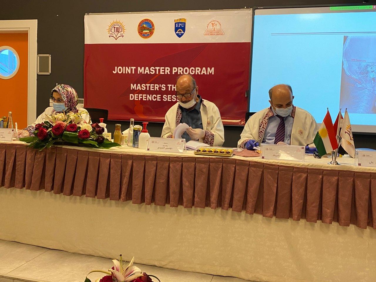 Dentistry Faculty in Tishk International University (TIU) started the first Joint Master Program in collaboration with Hawler Medical University (HMU) on April ,2018. On 12th August of 2020 , the third master defense session of the Joint Program was held in the presence of Dr.Duran Kala , the Dean of Dentistry Faculty -TIU , Dr.Rebuar Fadhil , the chief of Postgraduate Studies office-TIU , Dr. Diyar Khalid , the chief of Postgraduate Studies office-HMU and master defense committee members.