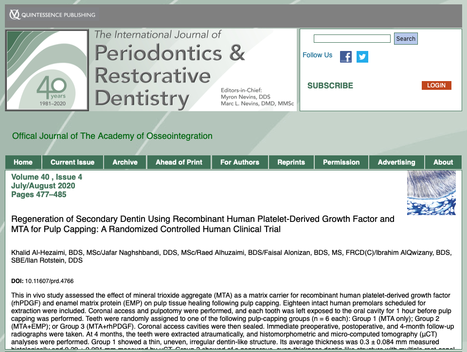 Regeneration of Secondary Dentin Using Recombinant Human Platelet-Derived Growth Factor and MTA for Pulp Capping: A Randomized Controlled Human Clinical Trial (http://quintpub.com/journals/prd/abstract.php?article_id=20361) Khalid Al-Hezaimi, BDS, MSc/Jafar Naghshbandi, DDS, MSc/Raed Alhuzaimi, BDS/Faisal Alonizan, BDS, MS, FRCD(C)/Ibrahim AlQwizany, BDS, SBE/Ilan Rotstein, DDS